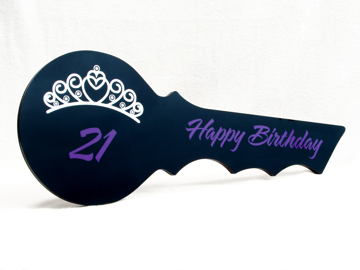 We make these 21st keys by laser cutting a black acrylic 21st key and decorating it with vinyl lettering. It has a wooden MDF backing for signatures.