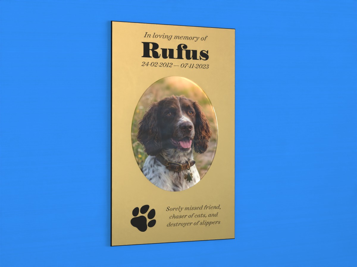 A laser engraved, two-ply acrylic, plaque with a photo of your loved one printed on and capped with a protective resin dome. This plaque is suitable for display indoors only.